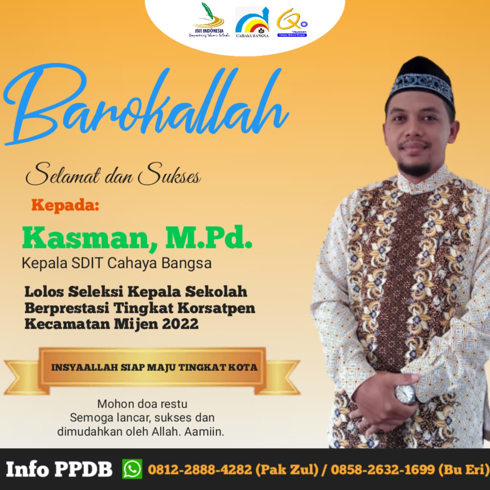 Barakallah kepada Bapak Kasman, M.Pd. kepala SD IT Cahaya Bangsa yang mendapat peringkat 1 dalam rangka Seleksi Lomba Kepala Sekolah Prestasi Tingkat Kecamatan Mijen pada tanggal 9 Maret 2022 yang diselenggarakan Korsatpen Kecamatan Mijen Kota Semarang. Mohon doa semoga mendapat juara 1 di tingkat Kota Semarang.
