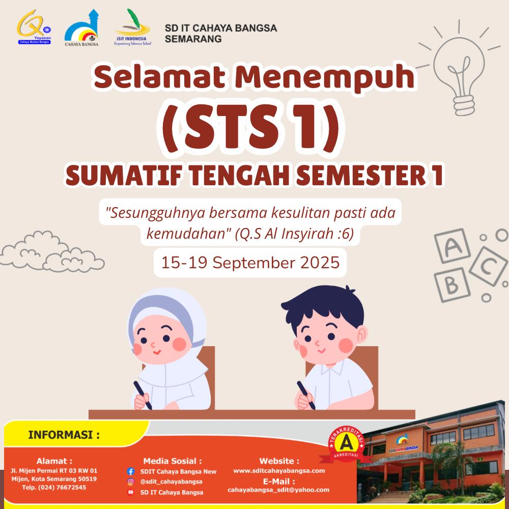 Pekan ini anak-anak sholih dan sholihah SD IT Cahaya Bangsa sedang melaksanakan Sumatif Tengah Semester 1. Mereka terlihat focus dan sudah menyiapkan diri dengan belajar lebih giat di rumah dibantu orang tua. Semangat belajar anak-anak sholih dan sholihah semoga mencapai hasil yang terbaik sesuai yang diharapkan.